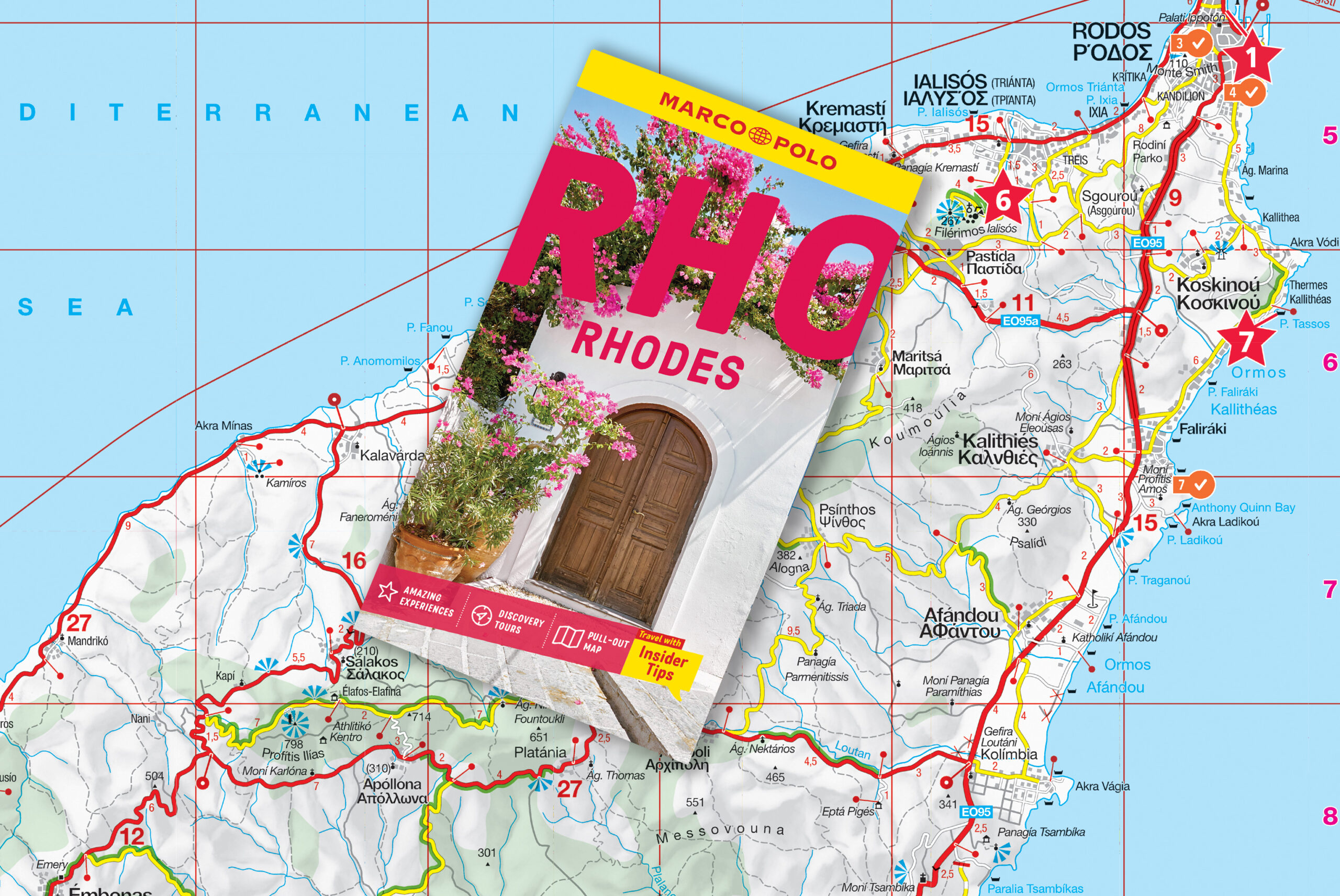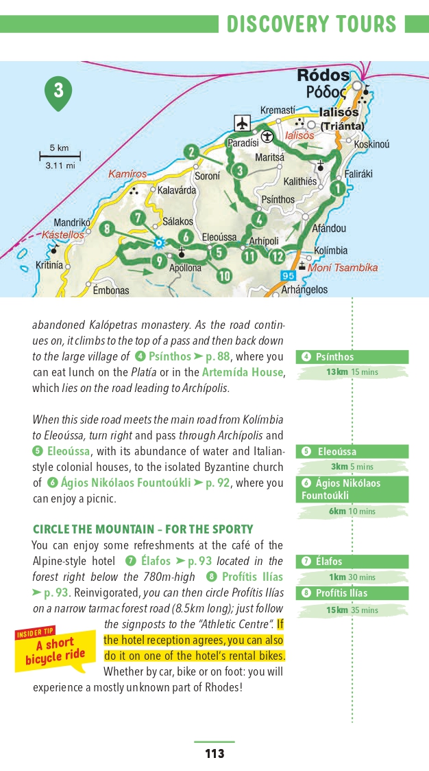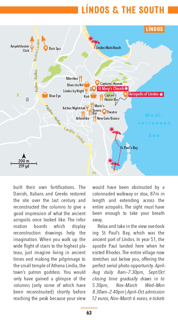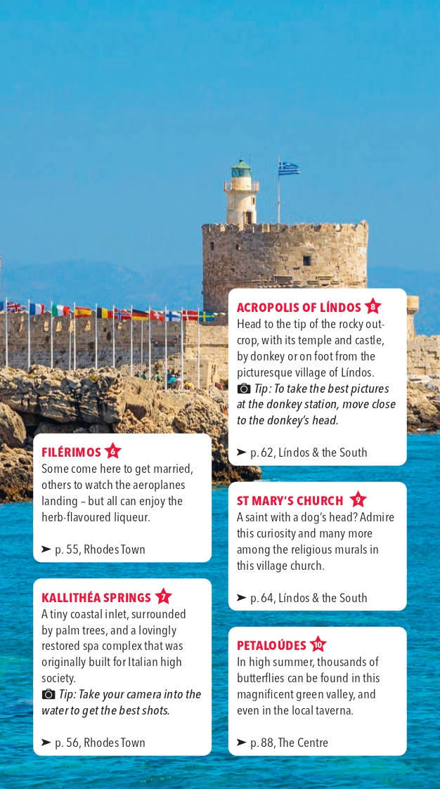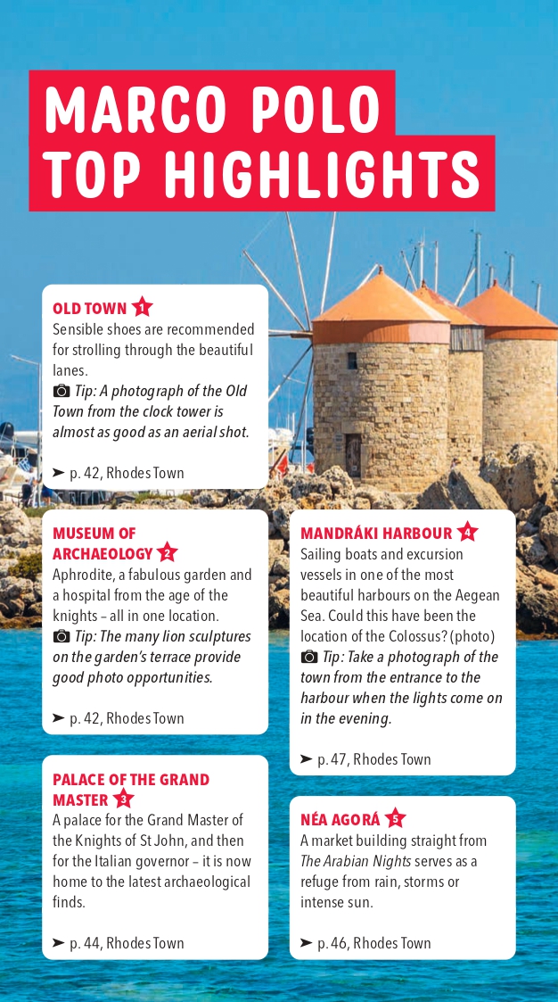 The Marco Polo Rhodes guide covers: Rhodes Town, Lindos, Apolakkia, Monolithos, Faliraki, Afantou, Kolimbia, Archangelos, Kamiros.