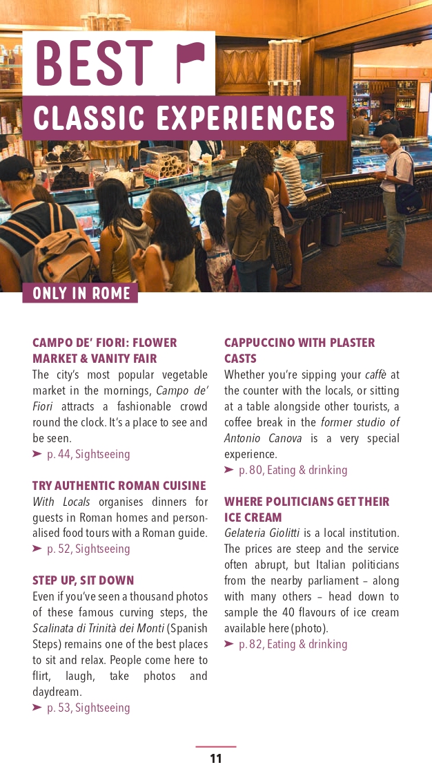 Rediscover the Eternal City whose classical temples, columns and baroque church facades shine in new splendour. Enjoy the fashion haven of the Alta Moda, a foamy cappuccino on a piazza, or immerse yourself in the trendy Testaccio district. This practical, pocket-sized guide will help you discover the best of Rome.